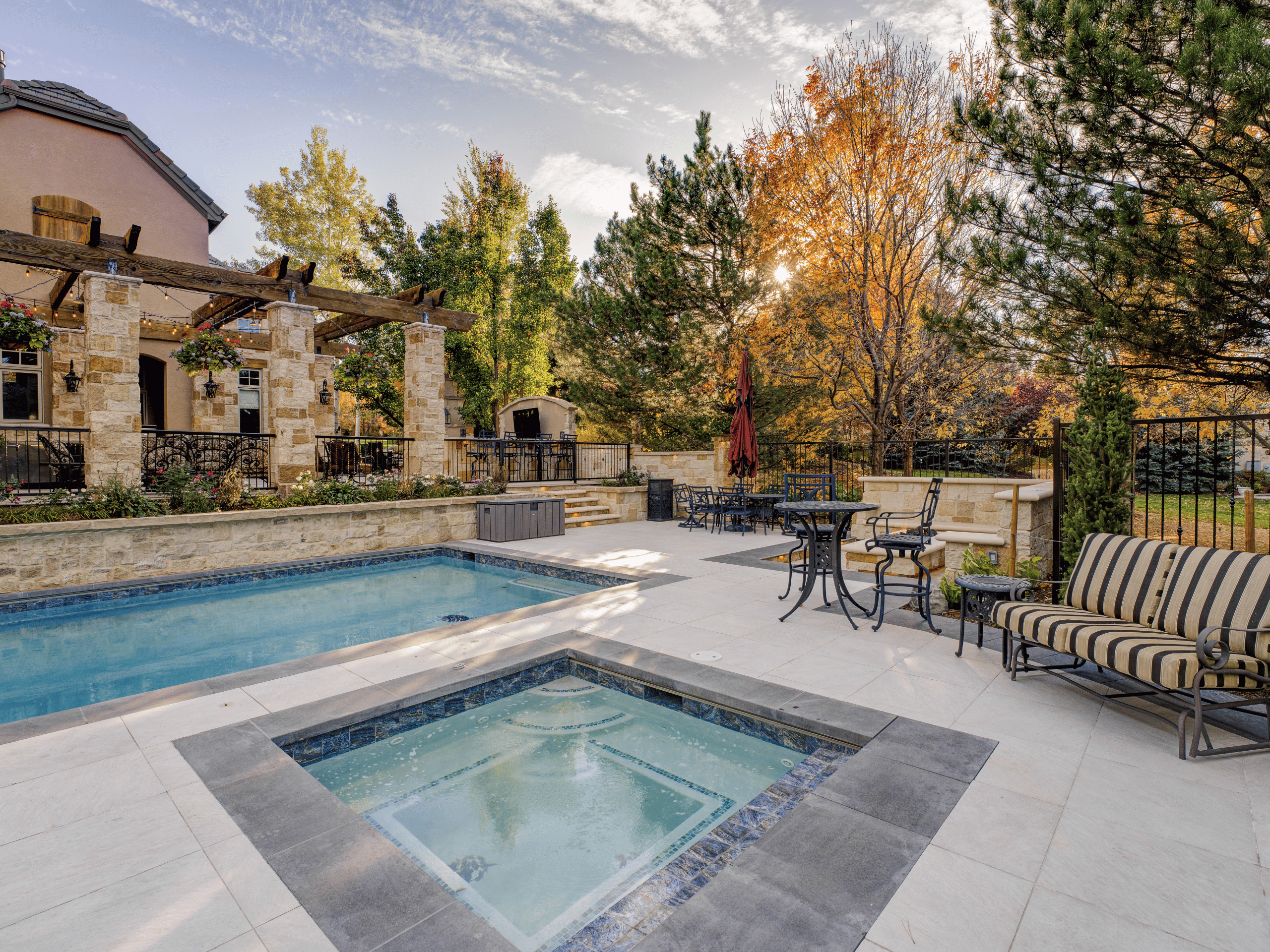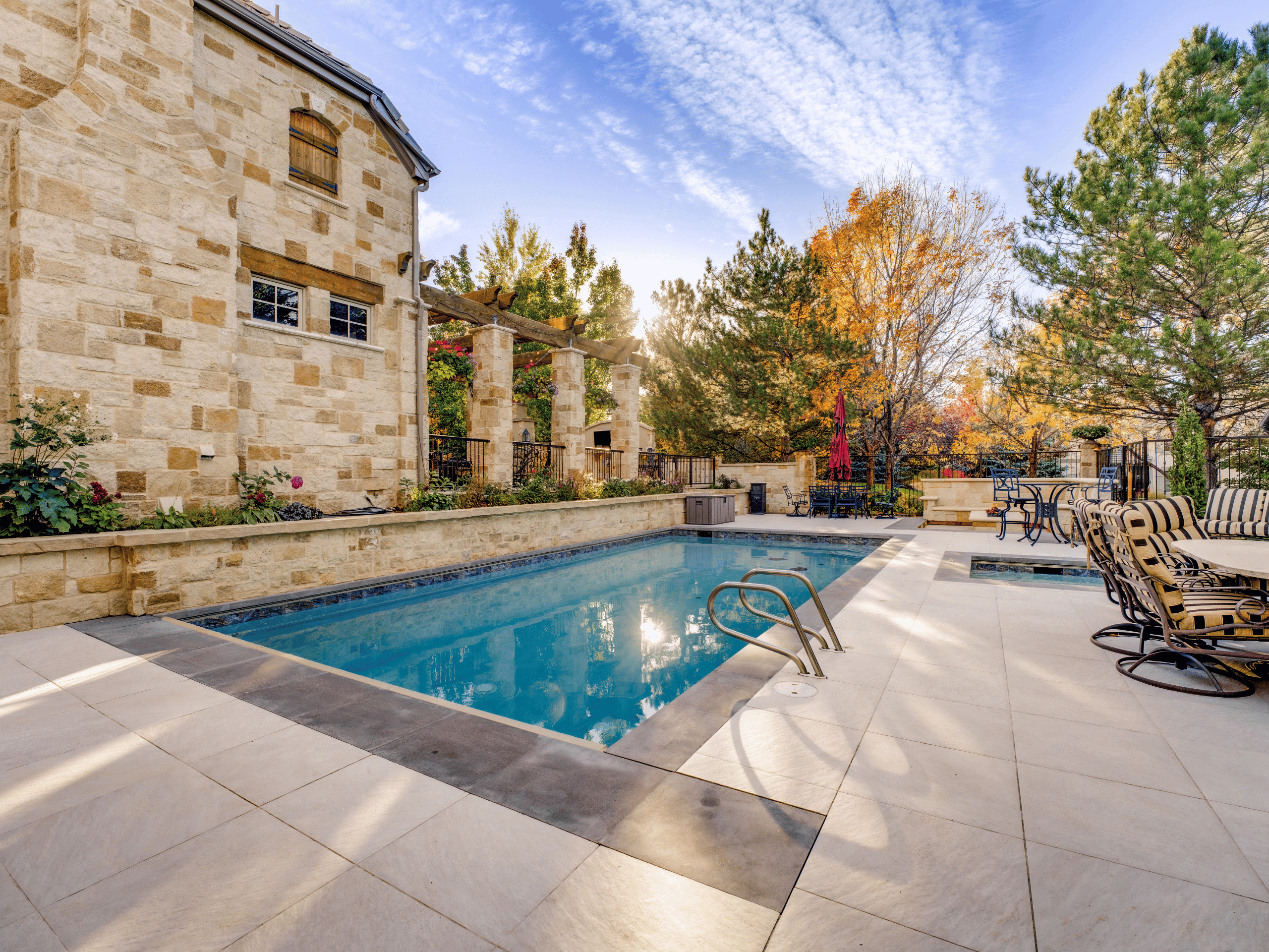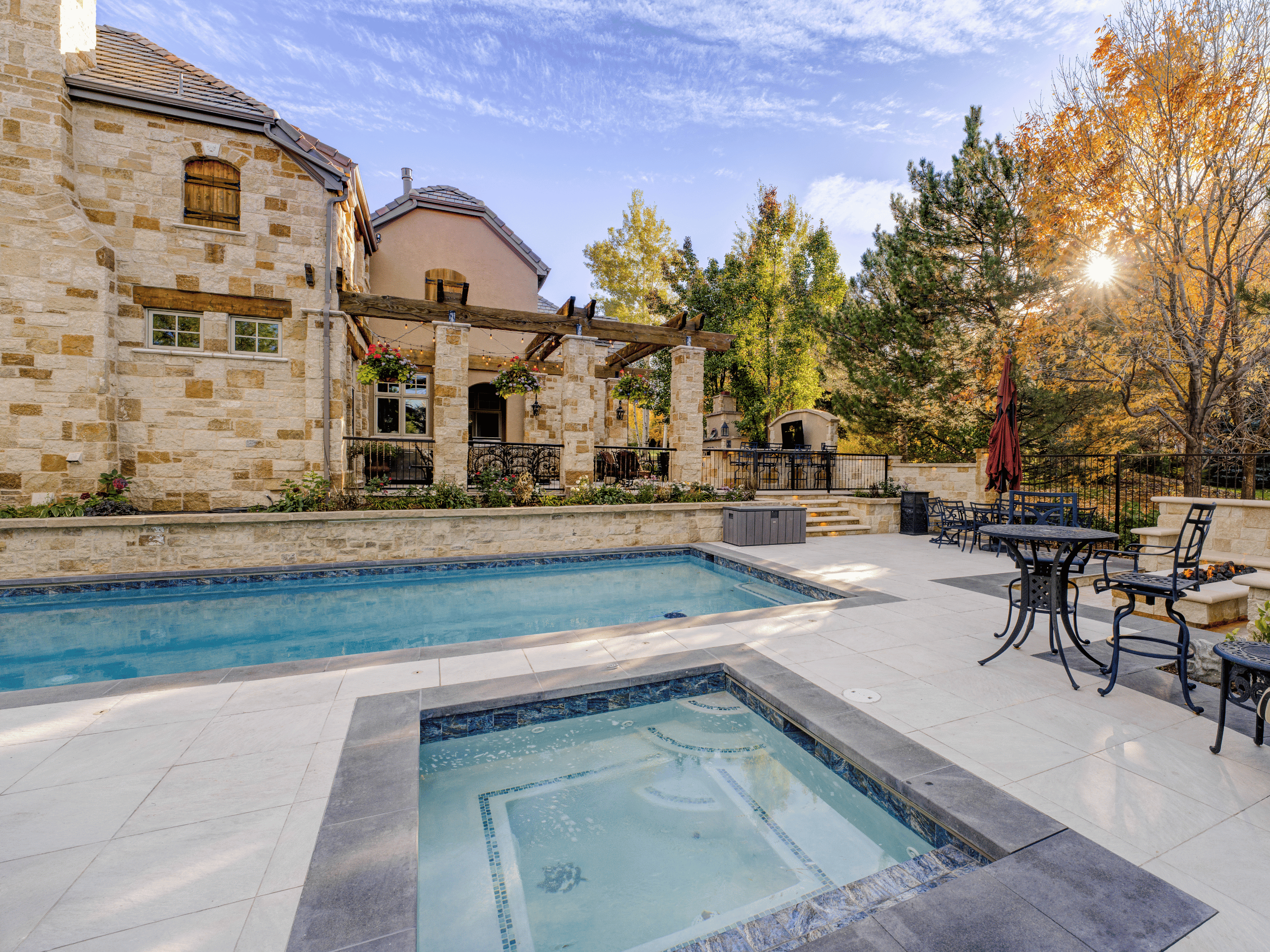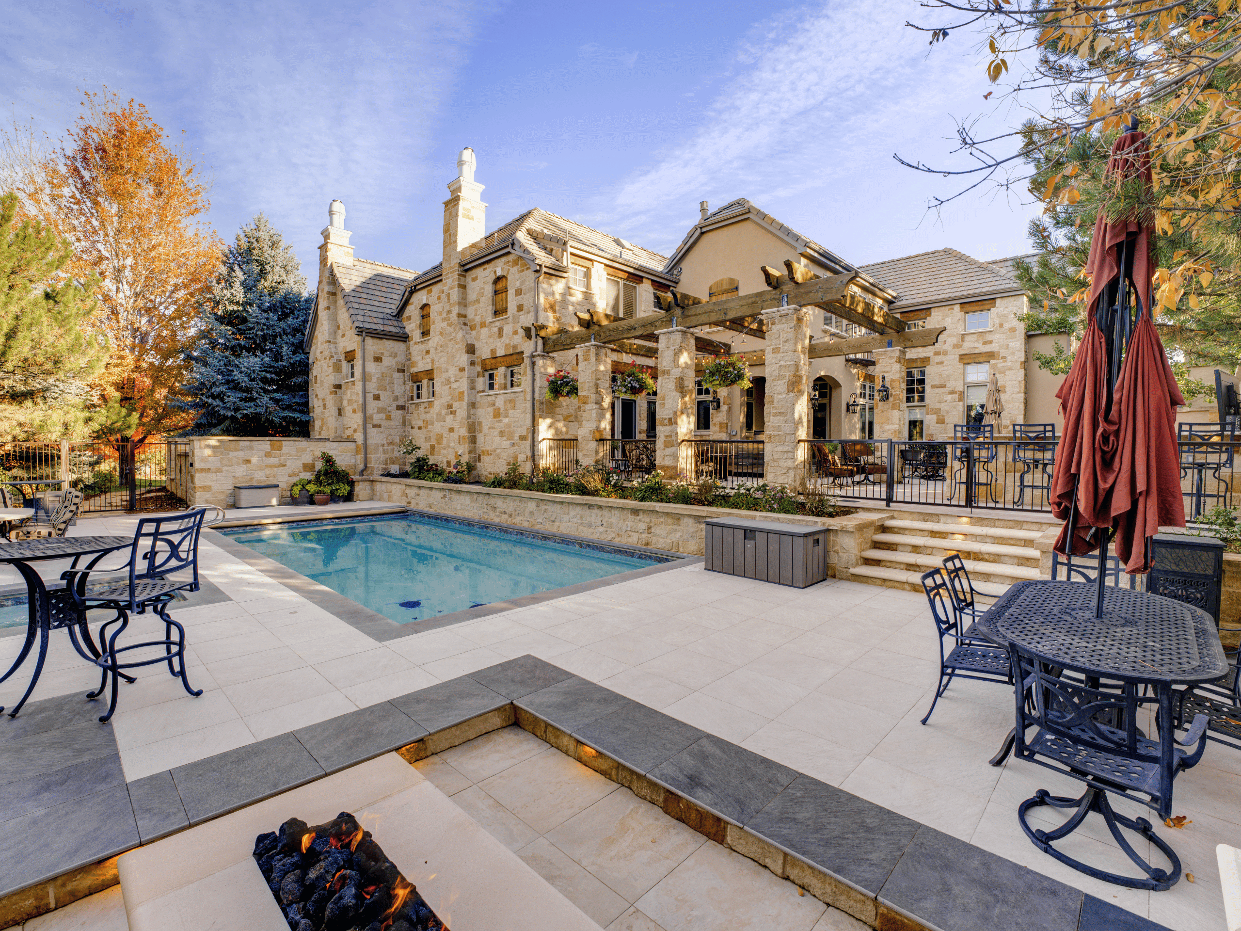 Below, the backyard opens to a sleek custom pool paired with a raised spa, offering the perfect place to cool off in the summer or unwind year-round. Expansive paver patios provide plenty of room for dining and lounging, while a built-in linear fire feature with surrounding stone seating creates an inviting gathering space as the sun sets. A custom masonry fireplace adds even more warmth and ambiance for crisp Colorado evenings.