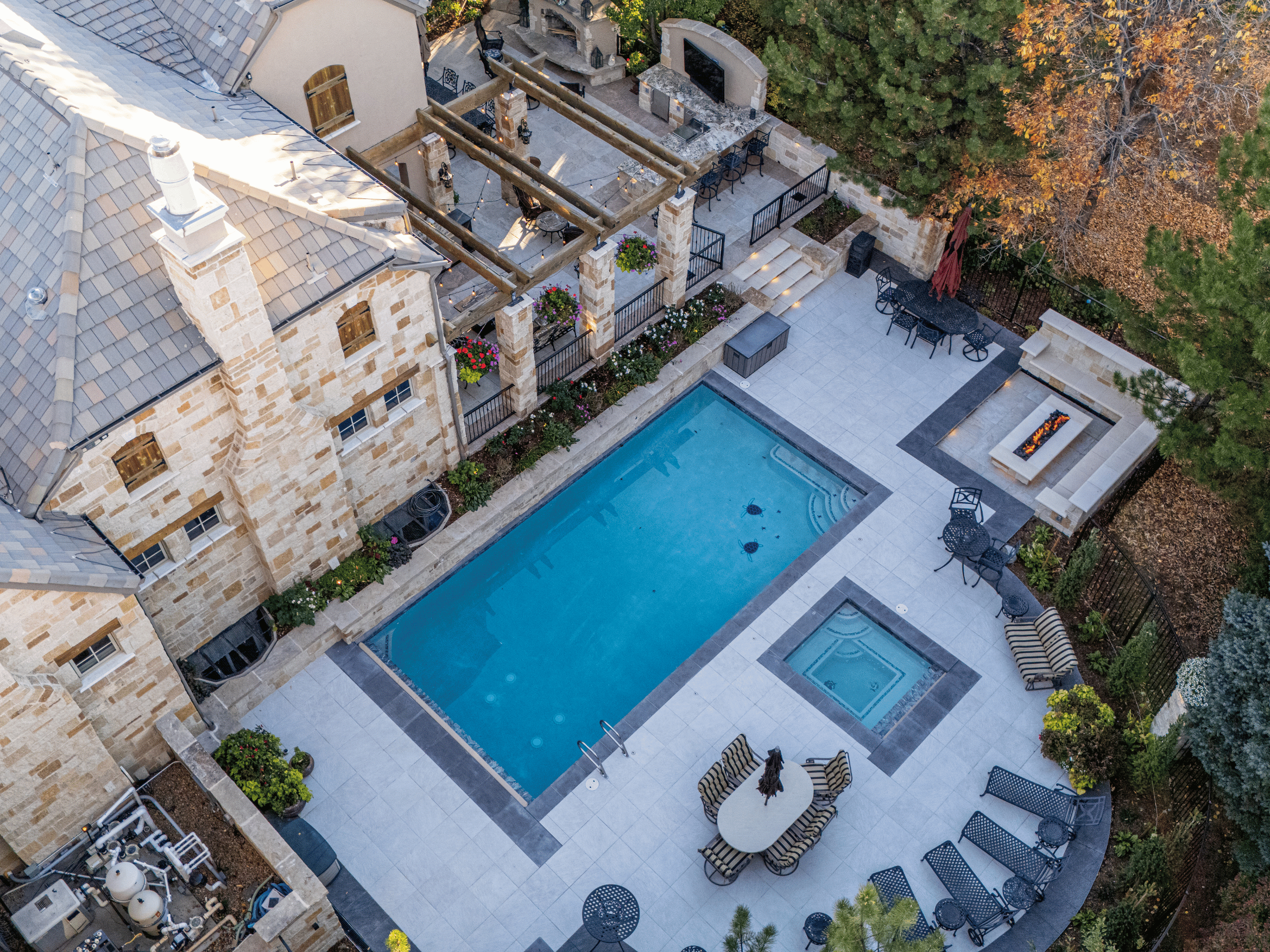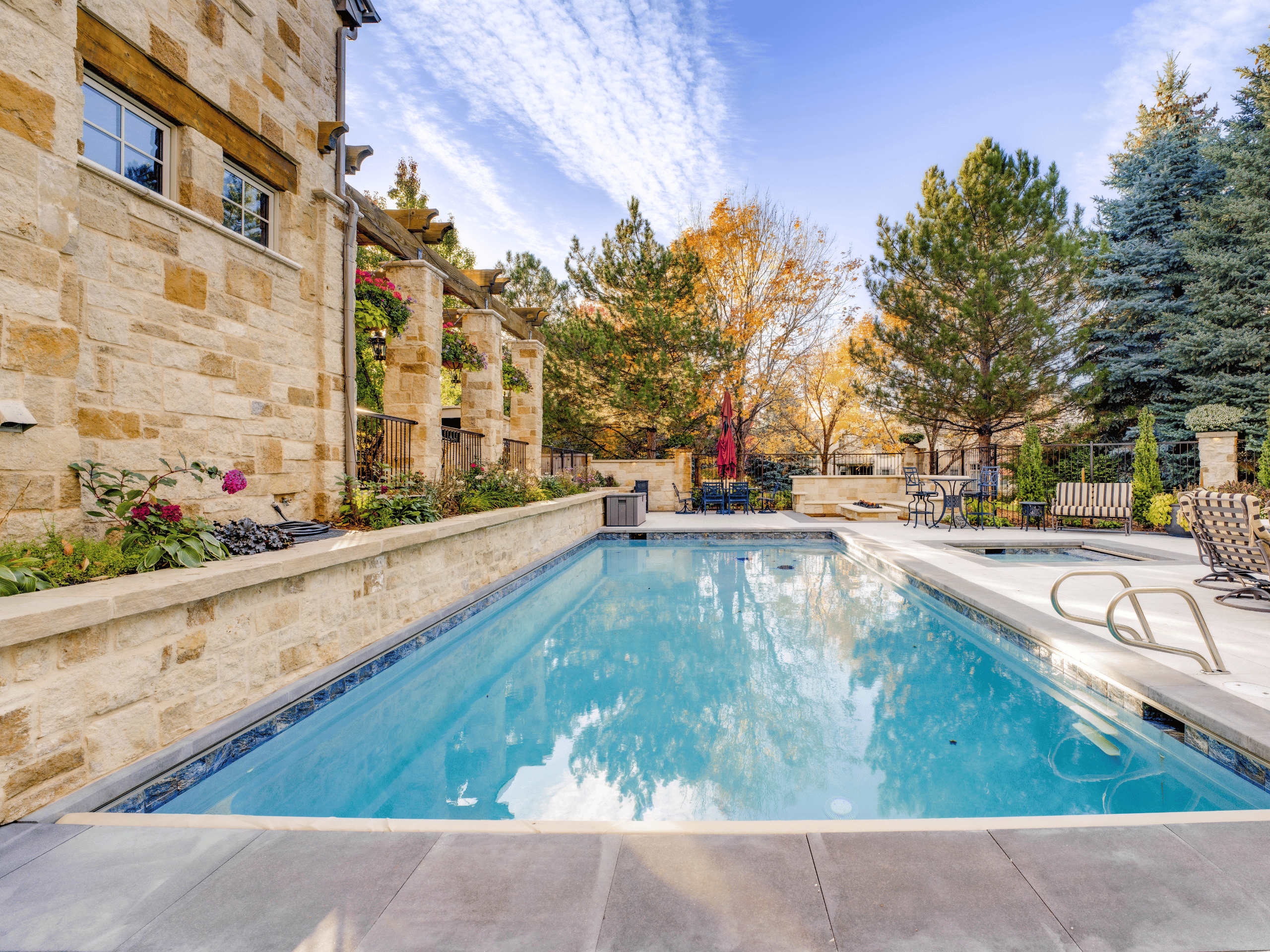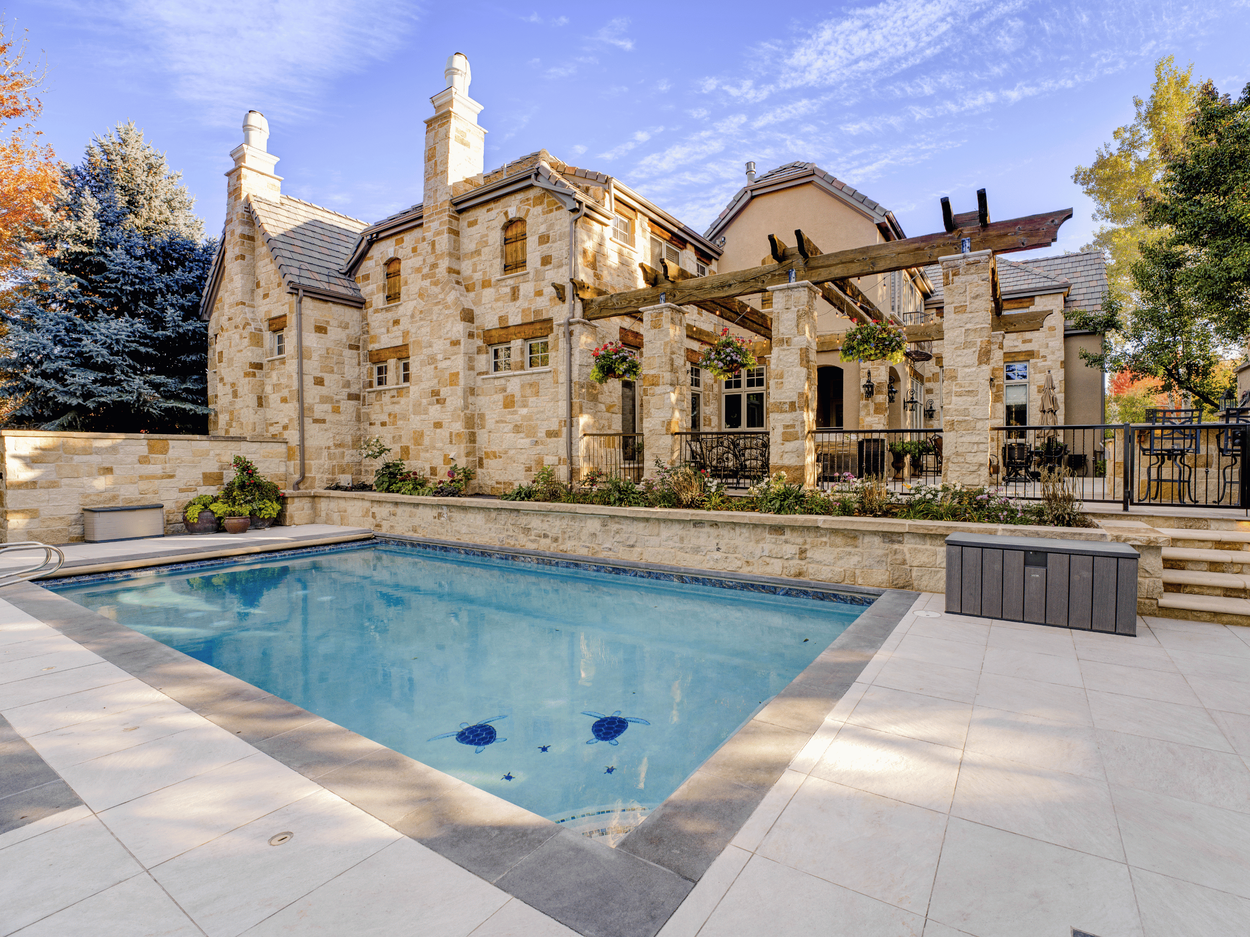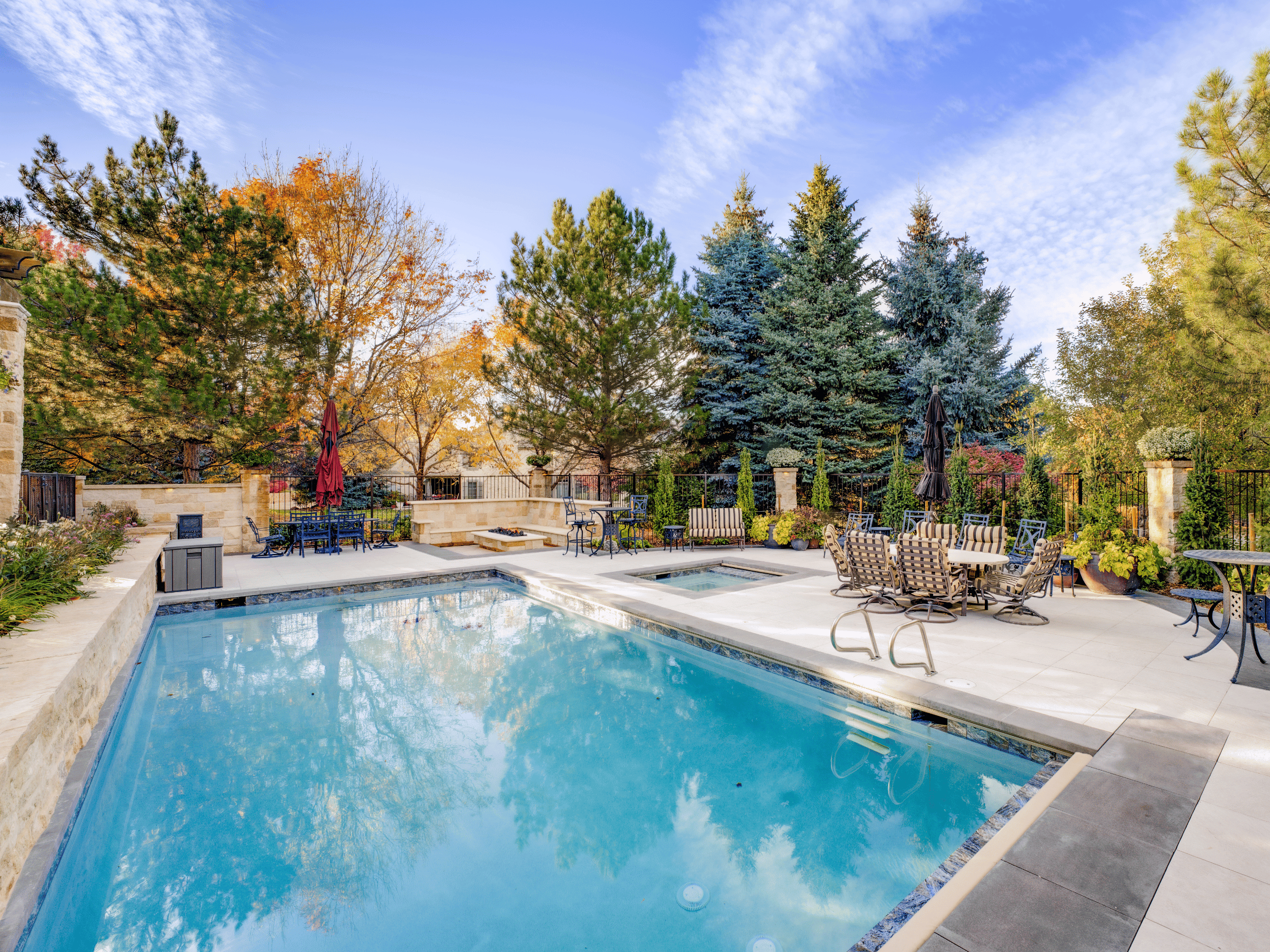 Below, the backyard opens to a sleek custom pool paired with a raised spa, offering the perfect place to cool off in the summer or unwind year-round. Expansive paver patios provide plenty of room for dining and lounging, while a built-in linear fire feature with surrounding stone seating creates an inviting gathering space as the sun sets. A custom masonry fireplace adds even more warmth and ambiance for crisp Colorado evenings.