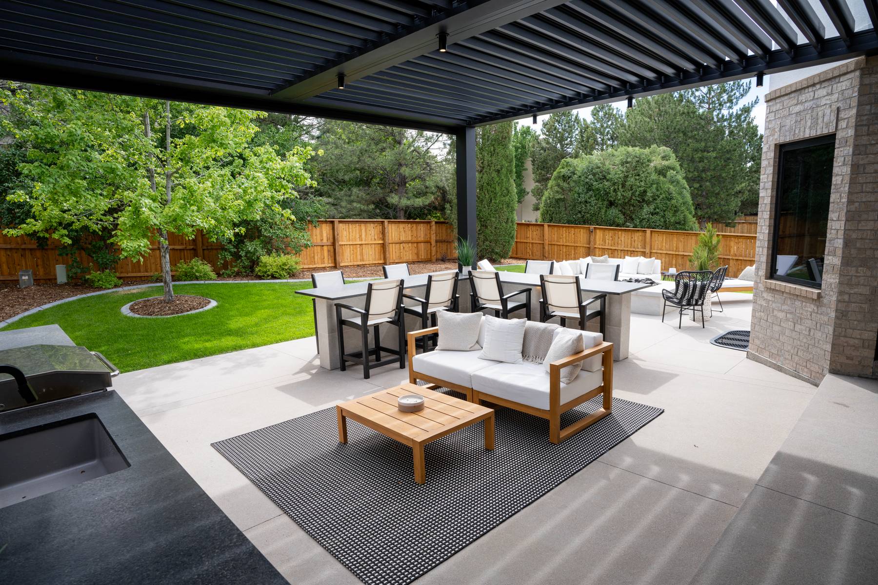 We designed an inviting outdoor living space that blends elegance with luxury and everyday functionality. At the heart of the space is a stylish fireplace, offering a cozy focal point for gatherings and relaxation. A custom walkway and patiocreate a natural flow, while a beautifully crafted outdoor structure provides both shade and architectural character. The fully equipped outdoor kitchen elevates alfresco dining with a touch of sophistication, enhanced by thoughtfully placed lighting that brings the entire space to life after sunset. Finished with lush landscaping that adds vibrancy and privacy, this outdoor environment now delivers a luxurious, polished experience perfect for both intimate evenings and lively celebrations.