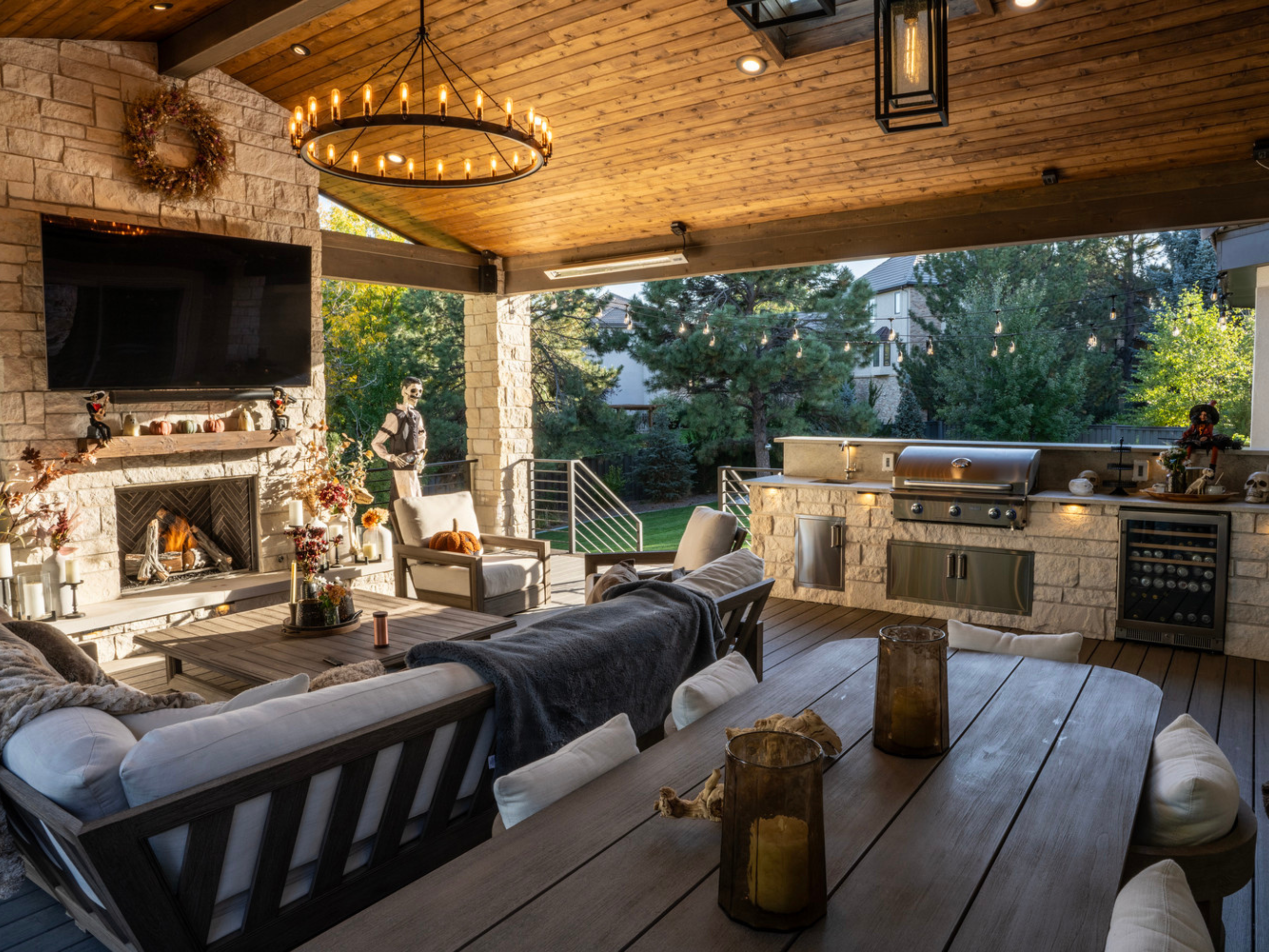 We created a warm and inviting outdoor living space designed to feel like an extension of the home. Under a beautiful outdoor structure, a full kitchen and comfortable seating area with a fireplace and TV set the stage for both everyday relaxation and entertaining. Thoughtfully placed lighting enhances the atmosphere, keeping the space inviting well into the evening. A striking staircase leads down to the lower patio, where additional seating overlooks a beautifully landscaped yard. The result is a homey retreat where comfort, connection, and functionality come together seamlessly.